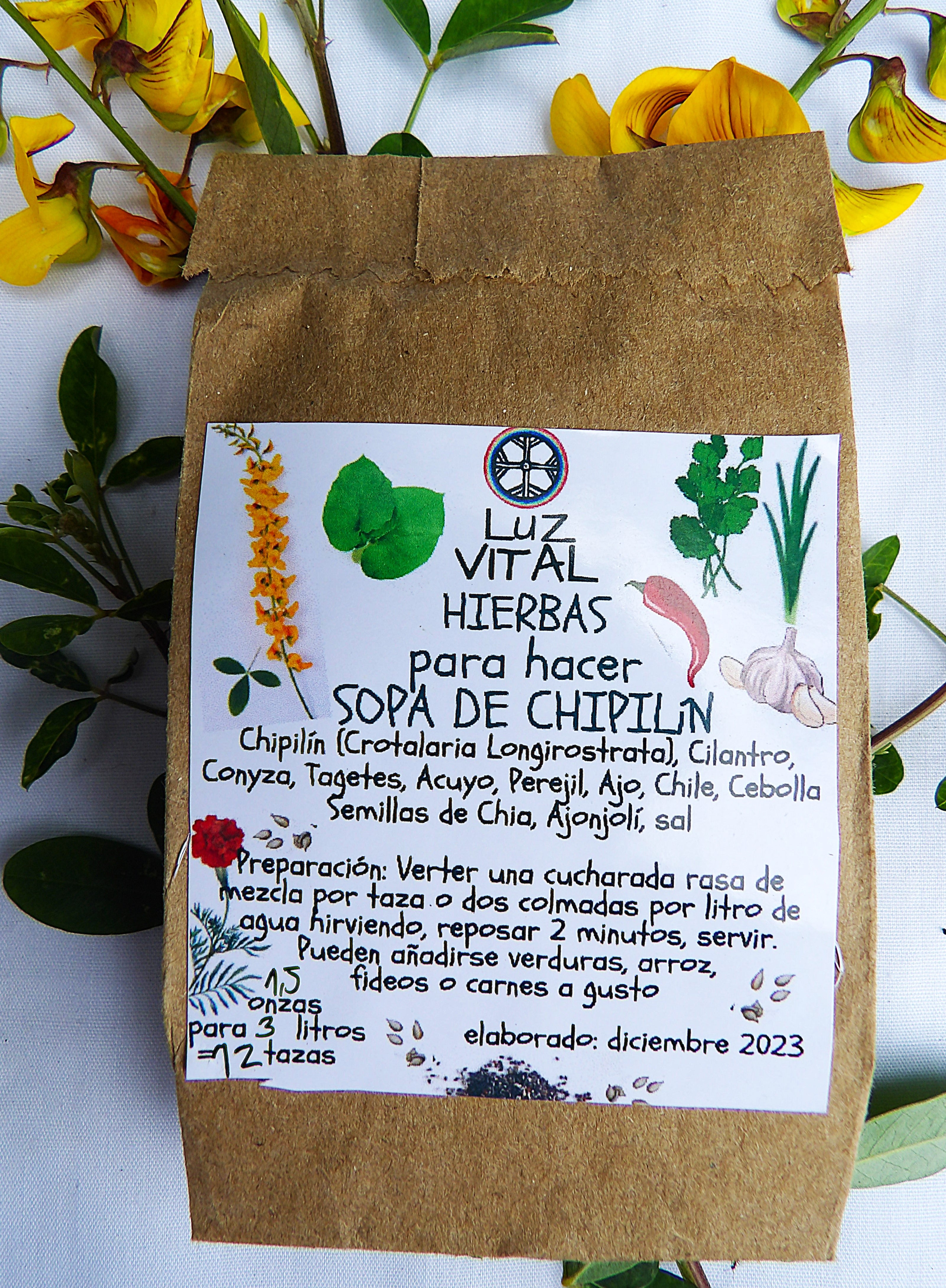 SOPA DE CHIPILÍN, sobre kraft de 1.5oz = 43gr. Rinde 3 litros de sopa = 12 tazas de 250 ml